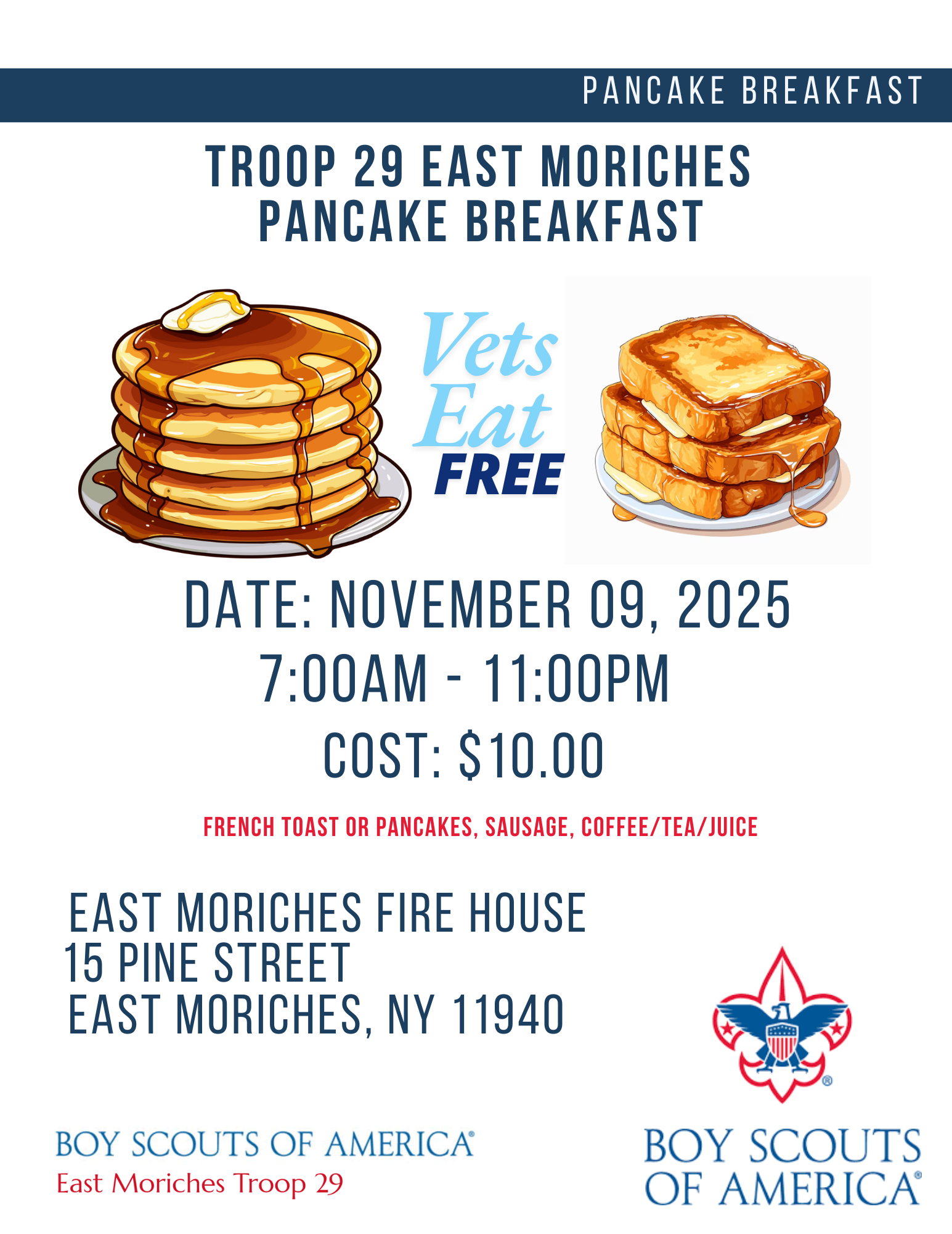 Start your morning with a delicious, hearty breakfast while supporting a great cause! Troop 29 of East Moriches invites you to our annual Pancake Breakfast Fundraiser β a community favorite filled with warm plates and even warmer hearts.